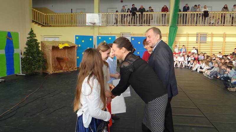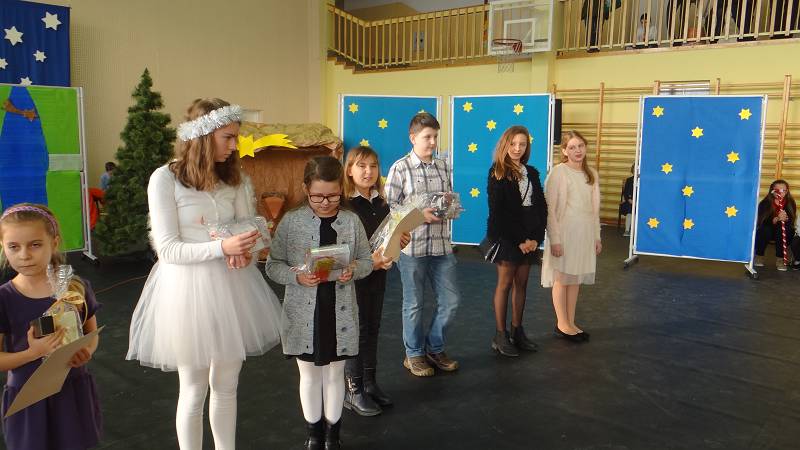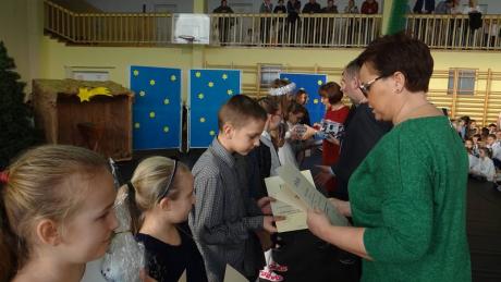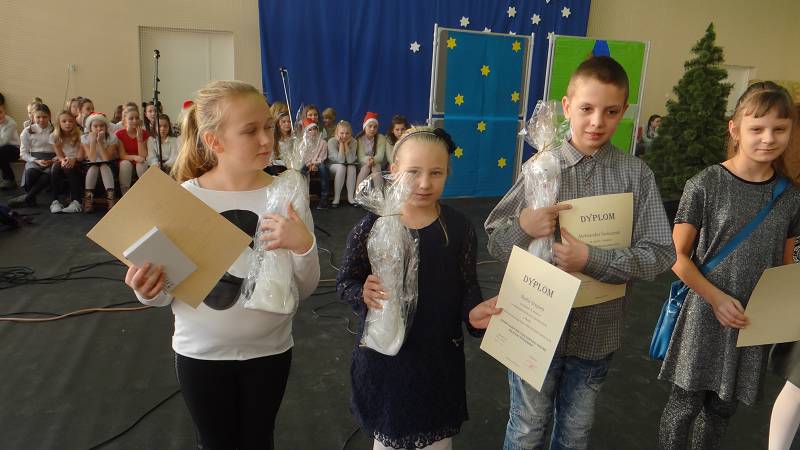Spotkanie rozpoczął dyrektor placówki Wiesław Smereczyński, który przypomniał ideę świąt i złożył społeczności szkolnej życzenia. Miłym akcentem uroczystości było wręczenie dyplomów i upominków laureatom szkolnego konkursu plastycznego, zorganizowanego z okazji Międzynarodowego Dnia Osób Niepełnosprawnych pod hasłem: "Gdyby każdy był taki sam, nikt nikomu nie byłby potrzebny". Samorząd Uczniowski SP 4 przyznał też nagrody za udział w konkursie o tradycjach Bożego Narodzenia. Natomiast w konkursie na najładniejszy, świąteczny wystrój klasy zwyciężyły 6a i 4d, które są gospodarzami sali 102.