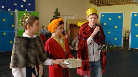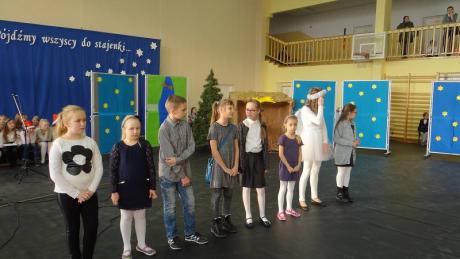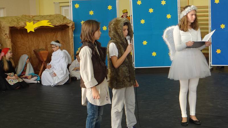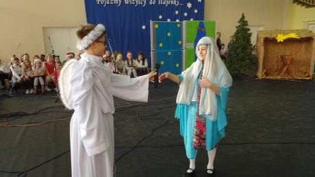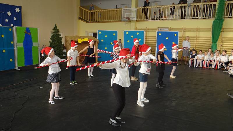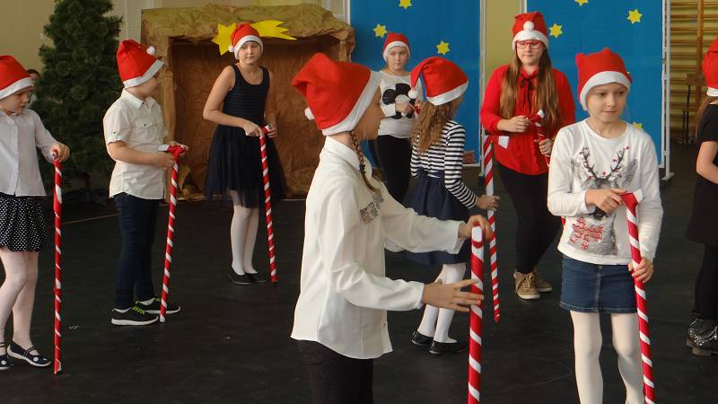 W części artystycznej zebrani obejrzeli tradycyjne jasełka i wysłuchali kolęd w wykonaniu najmłodszych uczniów z klas I - III oraz chóru szkolnego. Po radosnych pląsach Śnieżynek nadszedł czas na walkę dobra ze złem. Wymowne scenki nawiązywały do współczesnych zachowań ludzi i uświadomiły wszystkim, że święta Bożego Narodzenia, to nie tylko Mikołaj, prezenty i choinka. W pozorny, codzienny ład nagle wkroczyła grupa diabełków, która zasiała niepokój i skłóciła rodzinę. Dopiero anioły i dźwięki ich dzwoneczków przypomniały, o co tak naprawdę chodzi i zaprowadziły zgodę i harmonię.