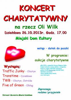 26.10.2013 r. o godz. 17.00 w Miejskim Domu Kultury w Działdowie odbędzie się Koncert Charytatywny na rzecz Oli Wilk