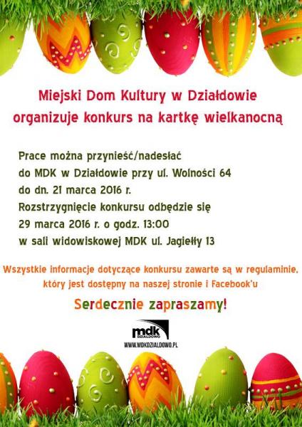 Wszystkie informacje dotyczące konkursu zawarte są w regulaminie, który jest dostępny na naszej stronie (www.mdkdzialdowo.pl) i Facebook'u