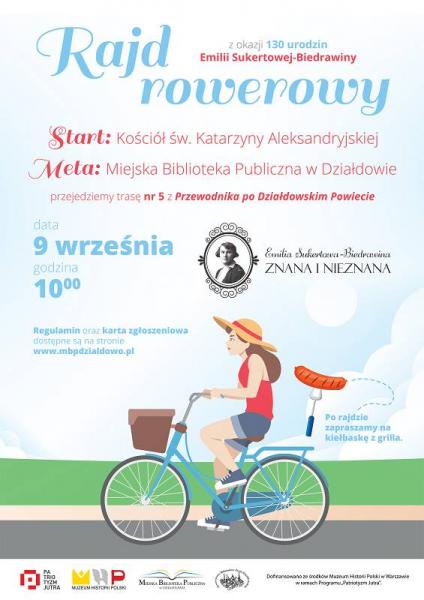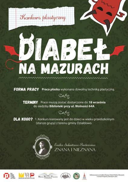 "Niemi świadkowie przeszłości"- wystawa fotografii Miejska Biblioteka Publiczna w Działdowie zaprasza na kolejną wystawę fotografii działdowianina, Rajmunda Szczepańskiego. Tym razem sfotografował on najstarsze budowle naszego powiatu, na zdjęciach można zobaczyć, m.in. drewniany młyn w Jabłonowie czy Kościół ewangelicki w Koszelewach. Wystawę można oglądać w Mediatece (ul. Wolności 64A) do 25 września 2017. Serdecznie zapraszamy! "Diabeł na Mazurach"- konkurs rysunkowy Miejska Biblioteka Publiczna w Działdowie zaprasza przedszkolaki (starsze grupy) z tereny gminy Działdowo do udziału w konkursie plastycznym. Prace plastyczne będące ilustracjami do bajek ze zbioru "Diabeł na Mazurach" można dostarczyć do siedziby Biblioteki do 18 września 2017. Technika pracy dowolna. Karta zgłoszeniowa i regulamin na stronie Biblioteki lub do odbioru osobiście w siedzibie. Konkurs jest jednym z działań, które realizuje Biblioteka wraz z partnerami Towarzystwem Miłośników Ziemi Działdowskiej i Zespołem Szkół w Malinowie w ramach projektu "Emilia Sukertowa-Biedrawina - znana i nieznana", który jest dofinansowany z programu "Patriotyzm jutra" ze środków Muzeum Historii Polski w Warszawie. Zapraszamy do udziału! Rajd rowerowy z okazji 130 rocznicy urodzin Emilii Sukertowej-Biedrawinie Miejska Biblioteka Publiczna w Działdowie zaprasza na rajd rowerowy z okazji 130 rocznicy urodzin Emilii Sukertowej-Biedrawiny. Start rajdu przy Kościele św. Katarzyny Aleksandryjskiej o godzinie 10.00, 9 września 2017 roku. Przejedziemy trasę nr 5 z "Przewodnika po Działdowskim Powiecie" Emilii Sukertowej-Biedrawinie. Trasa będzie liczyć około 15 km, dodatkowo podczas rajdu prezes Towarzystwa Miłośników Ziemi Działdowskiej, Marian Odachowski będzie opowiadał o Emilii Sukertowej-Biedrawinie. Koniec trasy w siedzibie Miejskiej Biblioteki Publicznej w Działdowie. Po rajdzie zapraszamy na kiełbaskę z grilla. Rajd jest jednym z działań, które realizuje Biblioteka wraz z partnerami Towarzystwem Miłośników Ziemi Działdowskiej i Zespołem Szkół w Malinowie w ramach projektu "Emilia Sukertowa-Biedrawina - znana i nieznana", który jest dofinansowany z programu "Patriotyzm jutra" ze środków Muzeum Historii Polski w Warszawie. Zapraszamy do udziału! Warsztaty plastyczne - zaproszenia na wernisaż wystawy o Emilii Sukertowej-Biedrawinie Miejska Biblioteka Publiczna w Działdowie zaprasza na warsztaty plastyczne, które odbędą z się 12 września 2017 roku o godzinie 15.00. Będziemy wykonywać zaproszenia na wernisaż wystawy o Emilii Sukertowej-Biedrawinie. Była ona działaczką społeczno-oświatową, pisarką związaną z Działdowszczyzną i regionem Warmii i Mazur, której w tym roku obchodzimy sto trzydziestą rocznicę urodzin. Warsztaty plastyczne są jednym z działań, które realizuje Biblioteka wraz z partnerami Towarzystwem Miłośników Ziemi Działdowskiej i Zespołem Szkół w Malinowie w ramach projektu "Emilia Sukertowa-Biedrawina - znana i nieznana", który jest dofinansowany z programu "Patriotyzm jutra" ze środków Muzeum Historii Polski w Warszawie. Zapraszamy do udziału! Informacja: Miejska Biblioteka Publiczna