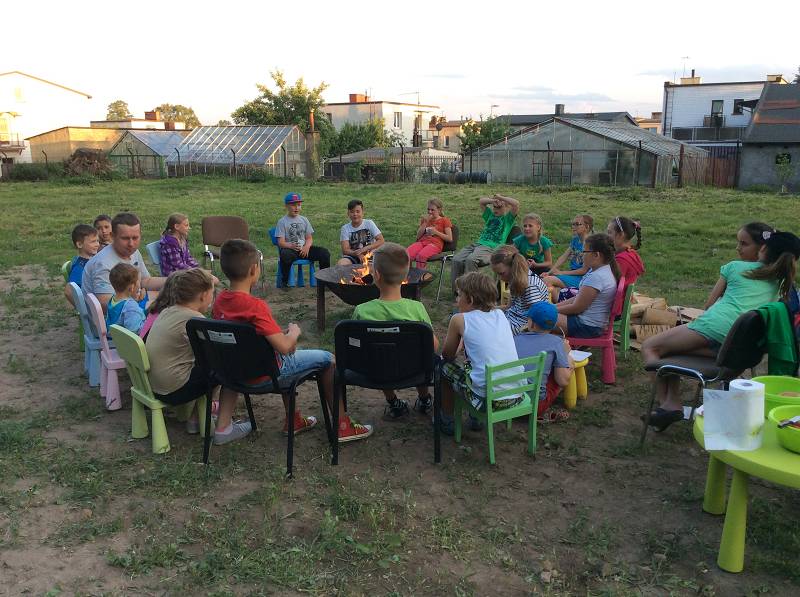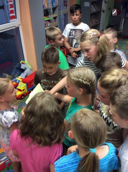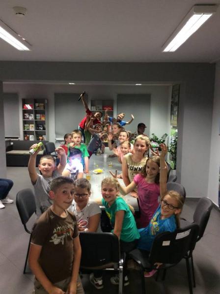 4 czerwca o godzinie 19.30 przybyło do naszej biblioteki 21 dzieci. Zaczęliśmy od ogniska z pieczeniem kiełbasek i śpiewania. Następnie po przekroczeniu drzwi wejściowych, na których umieszczony był groźnie wyglądający napis: "Każdy, kto o zmroku przekroczy próg tego budynku nie wyjdzie z niego przed świtem", trzeba było zostawić odcisk swojego palca i wypić kubek wybranego przez siebie napoju. Do wyboru był napar ze starych skarpetek, kompot ze ślimaków czy płyn na porost włosów...