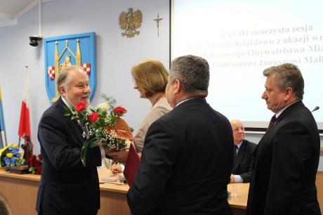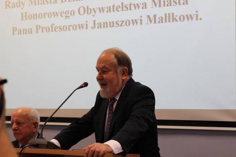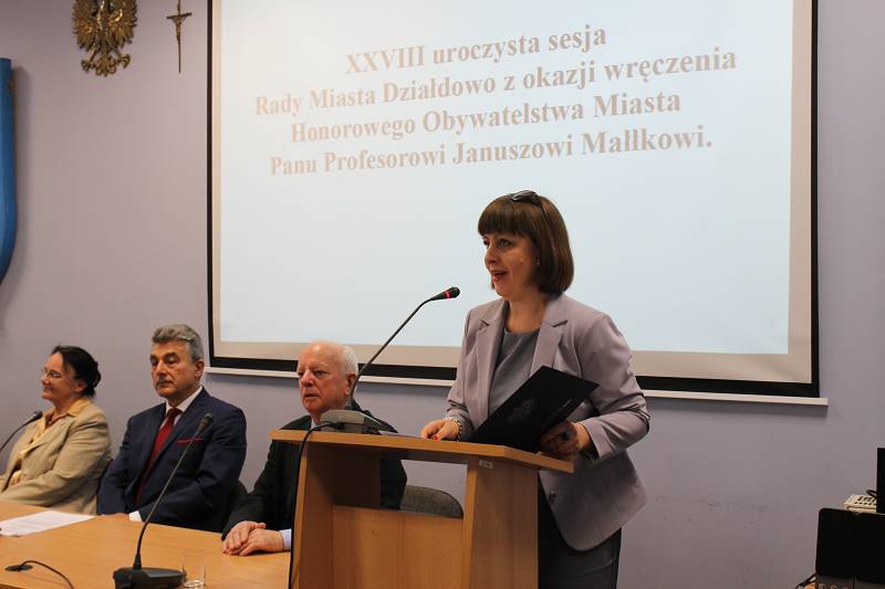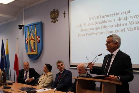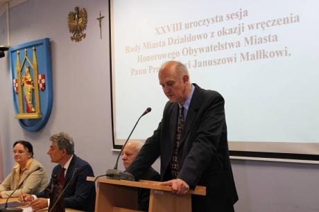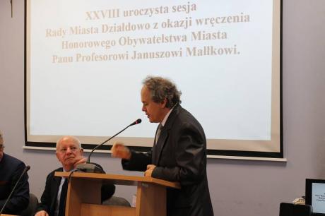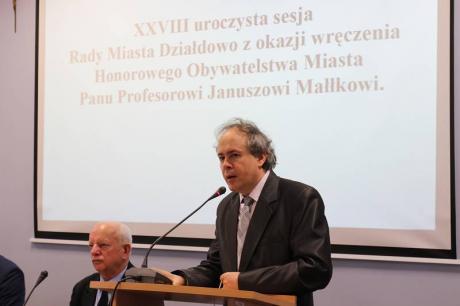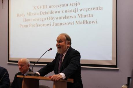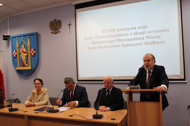 W dniu 24 czerwca odbyła się uroczysta sesja Rady Miasta Działdowa, podczas której profesor Janusz Małłek odebrał z rąk Burmistrza Grzegorza Mrowińskiego oraz Przewodniczącego Rady Romualda Remiszewskiego Honorowe Obywatelstwo Miasta Działdowa. Jest to czwarty tytuł Honorowego Obywatela przyznany w naszym mieście po roku 1990. Na uroczystość do sali konferencyjnej Urzędu Miasta przybyło liczne grono gości, wśród których znaleźli się m.in.: Przewodniczący Sejmiku Wojewódzkiego - P. Piotr Żuchowski, Szef Kancelarii Sejmiku Wojewódzkiego - P. Wiktor Leyk, Dyrektor Biura Wojewody Warmińsko-Mazurskiego - P. Agnieszka Warakomska-Poczobutt, Radna Sejmiku Wojewódzkiego - P. Teresa Nowskowska, Starosta Powiatu Działdowskiego - P. Marian Janicki oraz Przewodniczaca Rady Powiatu Działdowskiego - P. Magdalena Anczykowska. Nie zabrakło także przedstawicieli świata nauki, blisko współpracujących z prof. Małłkiem. Po zaprezentowaniu laudacji, przygotowanej przez prof. nadzw. dr. hab. Dariusza Makiłłę, prof. Janusz Małłek otrzymał przedmioty poświadczające otrzymanie tytułu Honorowego Obywatela: pamiątkową uchwałę Rady Miasta Działdowa o nadaniu tytułu, legitymację Honorowego Obywatela, statuetkę św. Katarzyny, flagę oraz herb Miasta Działdowa. Podczas uroczystości prof. Małłek został również uhonorowany Odznaką Honorową za Zasługi dla Województwa Warmińsko - Mazurskiego, którą wręczyli P. Piotr Żuchowski i Wiktor Leyk. Tego dnia w restauracji "Przedzamcze" odbyła się także konferencja naukowa pt. "Prusy Książęce w XVI-XVIII w. Ustrój - Prawo - Społeczeństwo - Kultura - Religia", podczas której swoje wystąpinia mieli prof. nadzw. dr hab. Dariusz Makiłła, prof. dr Udo Arnold, prof. nadzw. dr hab. Jan Gancewski, prof. dr hab. Jacek Wijaczka, prof. dr hab. Grzegorz Białuński, prof. dr hab. Stanisław Achremczyk, prof. nadzw. dr hab. Andrzej Kamieński, dr Danuta Bogdan. Dysusję podsumował prof. dr hab. Janusz Małłek.