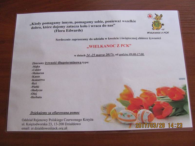 Oddział Rejonowy Polskiego Czerwonego Krzyża w Działdowie w dniach 17-18 marca i 24-25 marca 2017 r. przeprowadził na terenie miasta Działdowo, ale również w Iłowie świąteczną zbiórkę żywności i kwestę w sklepach: Netto, Rast, Prim, Kredens, Intermarche, Sano, Tesco i Stokrotka. 60 wolontariuszy z Gimnazjum w Burkacie, Gimnazjum nr 2 w Działdowie, Zespołu Szkół nr 2 w Działdowie i Zespołu Szkół Zawodowych w Iłowie kwestowało i zbierało żywność przez drugi i trzeci weekend marca. Efektem ich starań było: zebranie żywności o wartości 1347,25 zł i pieniędzy do puszek kwestarskich na łączną kwotę 1776,20 zł.