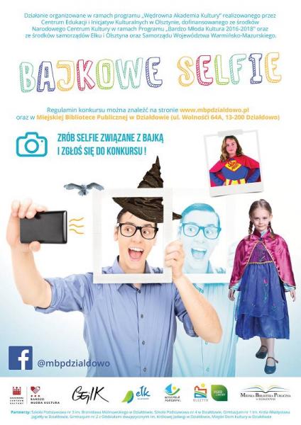 Miejska Biblioteka Publiczna w Działdowie zaprasza wszystkich niezależnie od wieku do udziału w konkursie "Bajkowe selfie", który organizujemy w ramach projektu "Zabajkowani, czyli zakręceni na punkcie bajki". Konkurs ma na celu odświeżenie bajek i baśni, przypomnienie ich ponadczasowych wartości. Aby wziąć udział w konkursie należy samodzielnie wykonać bajkowe selfie, tzn. związane z bajką, np. selfie z ulubioną bajką - książką, ucharakteryzowanie (przebranie się za) na postać z bajki itp. Liczymy na waszą kreatywność! Prace należy przesłać do 18 września 2016 roku na adres e-mail: biblioteka@mbpdzialdowo.pl. Regulamin dostępny na stronie biblioteki i w siedzibie na ul. Wolności 64A. Przewidujemy przyznanie 3 nagród i dodatkowo nagrody publiczności dla selfie, które zdobędzie najwięcej