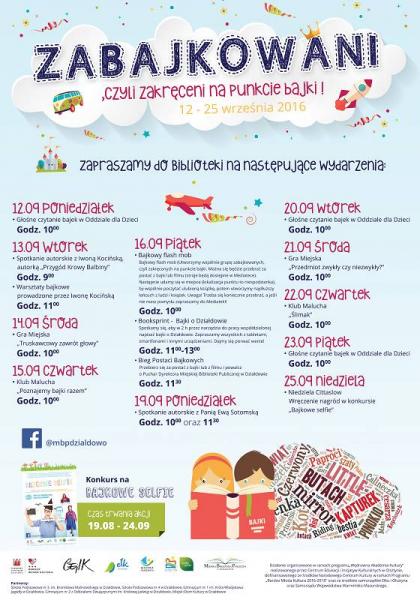 Projekt rozpoczął się od konkursu na "Bajkowe selfie", który ogłosiliśmy 19 sierpnia 2016 r. Będzie trwał do 25 września, kiedy w trakcie Niedzieli Cittaslow ogłosimy zwycięzców. W poniedziałek 12 września ruszamy z głośnym czytaniem bajek w Oddziale dla Dzieci. Przez następne 2 tygodnie czekają na nas: spotkania autorskie z autorami bajek, bajkowe gry miejskie, bajkowy flash mob, bajkowy booksprint, bieg postaci bajkowych. Zapraszamy serdecznie wszystkich do naszej bajkowej biblioteki. Szczegóły dostępne w siedzibie biblioteki i na plakatach akcji.