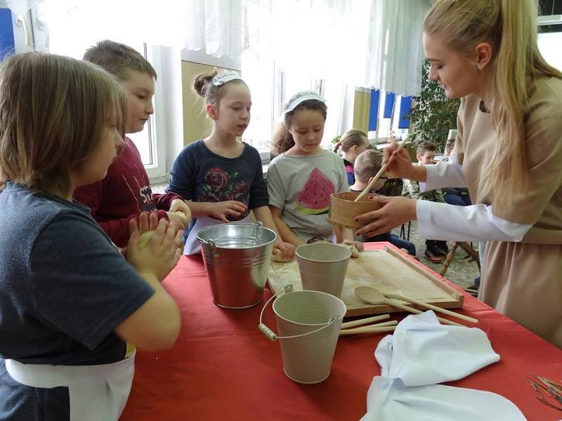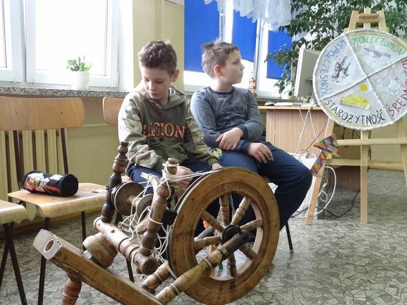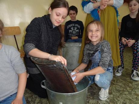 30 marca za sprawą wehikułu czasu uczniowie przenieśli się na dwór królewski, gdzie poznali etykietę dworską. Spotkali się z królową, a nawet towarzyszyli jej jako świta. Królowa przedstawiła atrybuty władzy królewskiej, a ciężar korony mogliśmy poznać na swoich głowach. Następnie przenieśli się do wsi sprzed stu lat. Poznali przedmioty codziennego użytku takie jak: kołowrotek, tara do prania, lampa naftowa, żelazko z duszą. Większość uczniów po raz pierwszy na żywo zetknęła się z przedmiotami, którymi posługiwali się nasi przodkowie. Wcielili się w rolę mieszkańców wsi. Z wielką przyjemnością oddali się zajęciom praktycznym takim jak: pranie, prasowanie, zagniatanie chleba, przędzenie.