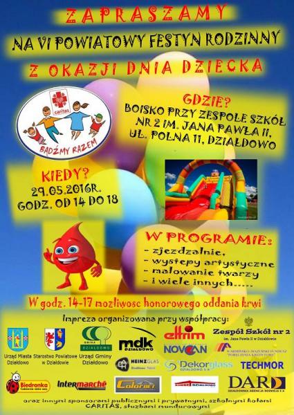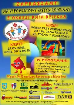 Zapraszamy na VI Powiatowy Festyn Rodzinny z okazji Dnia Dziecka. W programie liczna atrakcje dla dzieci: zjeżdżalnie, występy artystyczne i wiele innych.