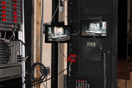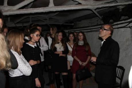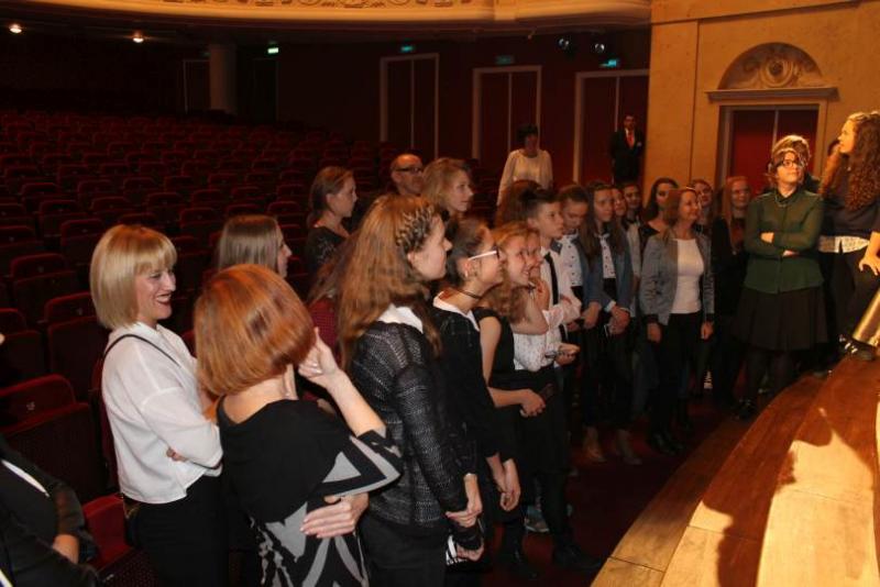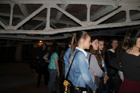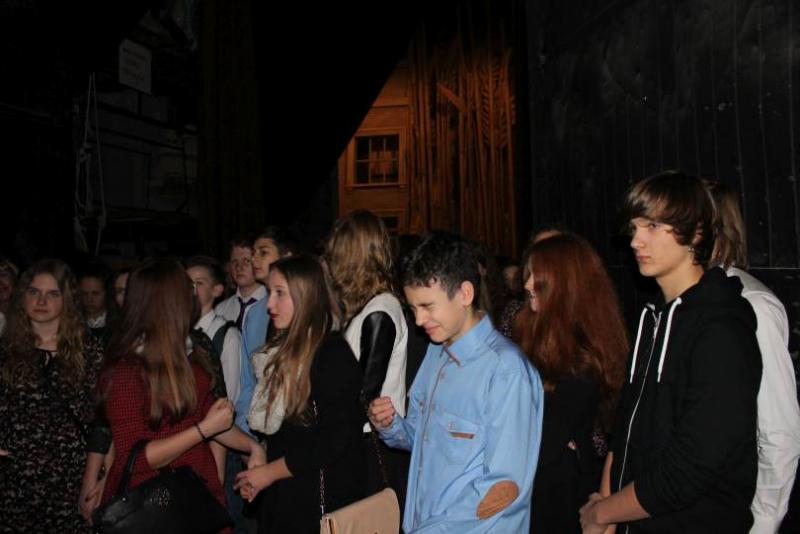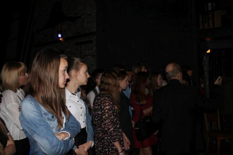 Przed spektaklem pan Jerzy Jaroszyński, pracownik teatru, zabrał młodzież na krótką wycieczkę po najbardziej interesujących miejscach w budynku. W trakcie zwiedzania zaplecza technicznego, rekwizytorni czy pomieszczenia pod obrotową sceną, prowadzący opowiadał o historii jednego ze starszych teatrów w Warszawie. Uczniowie chętnie wysłuchali opowieści o burzliwych dziejach gmachu. Pan Jerzy opowiedział o pracy teatru przed wojną, o sposobach radzenia sobie z nagłośnieniem czy oświetleniem. Uczniowie poznali zasady funkcjonowania teatru w trakcie przygotowania spektaklu. Pracownik przedstawił jak zmieniała się rola suflera, jak wprowadzono dodatkowe możliwości wykorzystania sceny. Opowiadał o pracy dyrektora teatru czy pracownika promocji. Przypomniał młodzieży o przyjętych normach dotyczących kulturalnego zachowania się w teatrze.