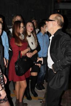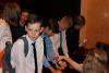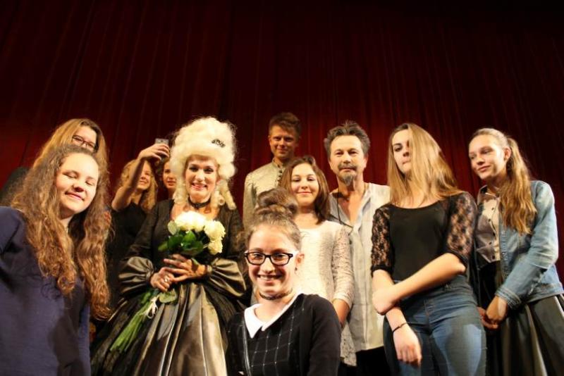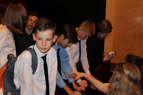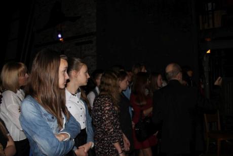 Po spektaklu na uczniów czekała miła niespodzianka. Na rozmowę dotyczącą zawodu aktora zgodzili się p. Joanna Trzepiecińska, p. Piotr Cyrwus oraz dwóch aktorów teatralnych młodego pokolenia Marta Kurzak i Paweł Krucz. Aktorka zachęcała uczennice biorące udział w konkursach poetyckich do obcowania z literaturą piękna oraz czynnego udziału we wszelkich przeglądach czy konkursach. Opowiadała historię swojej kariery zawodowej. Pana Piotr Cyrwus był bardzo zadowolony, że młodzi ludzie coraz częściej przyjeżdżają do teatru, nawet w sobotni wieczór. Po bardzo ciekawej i pouczającej rozmowie, drugoklasiści zrobili sobie pamiątkowe zdjęcie. Ten mglisty wieczór na pewno zastanie długo w pamięci młodzieży gimnazjalnej.