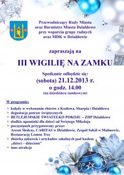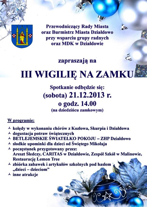 Przewodniczący Rady Miasta oraz Burmistrz Miasta Działdowo przy wsparciu grupy radnych oraz MDK w Działdowie zapraszają na III WIGILIĘ NA ZAMKU
