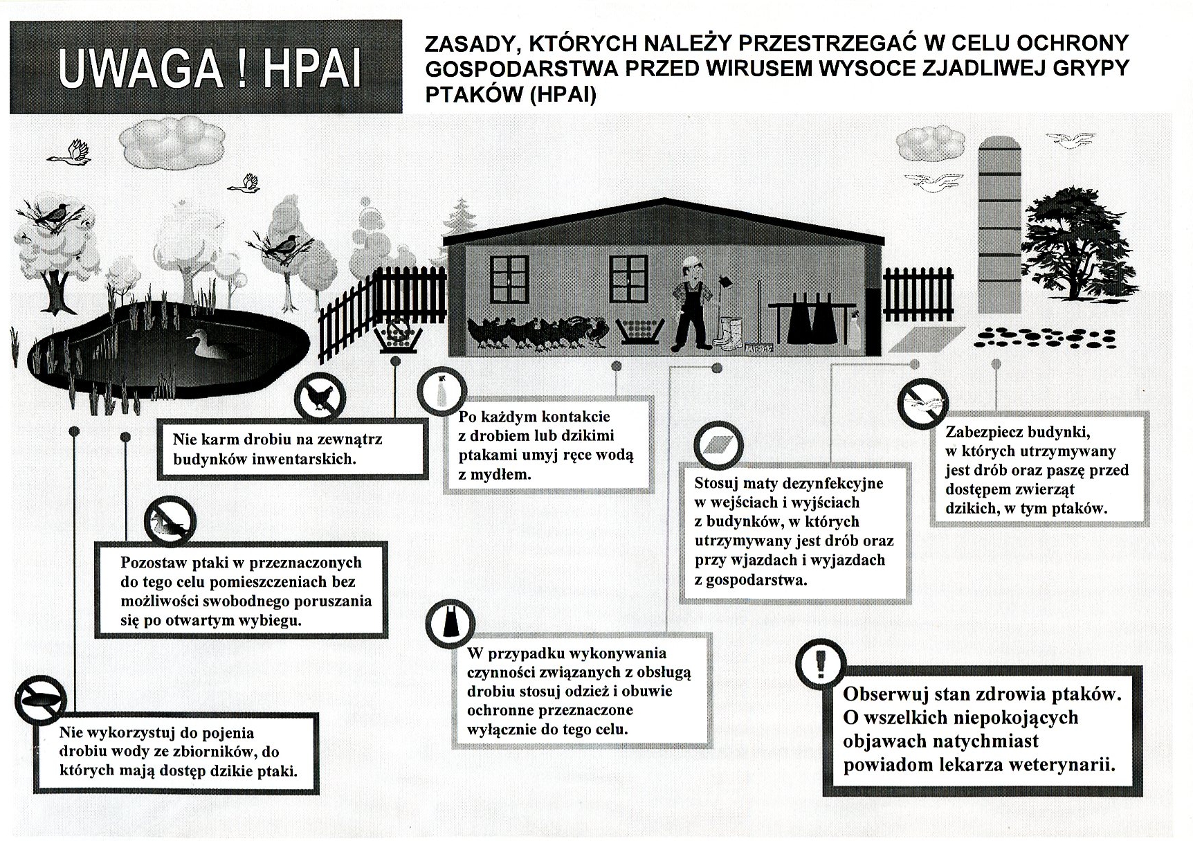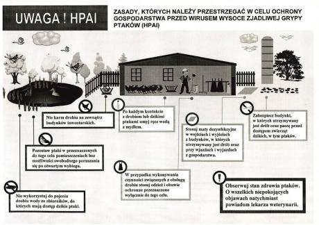 Zgodnie z rozporządzeniem Ministra Rolnictwa i Rozwoju Wsi z dnia 20 grudnia 2016 roku w sprawie zarządzenia środków związanych z wystąpieniem wysoce zjadliwej grypy ptaków, które weszło w życie 28 grudnia 2016 roku, należy między innymi: