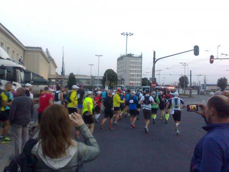 W sobotę rano pobudka o 2:30, śniadanko kawa i na start, który miał nastąpić o 4:30. Na miejscu startu (dworzec PKP Gdynia Główna) byłem już o 3:50 ? powoli zaczyna przybywać zawodników. O 4:30 zgodnie z planem nastąpił start, wystartowało ok. 130 osób. Początek zgodnie założonym planem spokojne tempo (motto przeczytane w książce o biegaczach "Im wolniej zaczniesz, tym szybciej skończysz") i coś w tym jest. Po 15 km pierwszy pit stop, biorę moją paczkę zjadam bułkę z masłem orzechowym, snikersa i zapijam puszką coli, biegnę dalej.