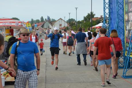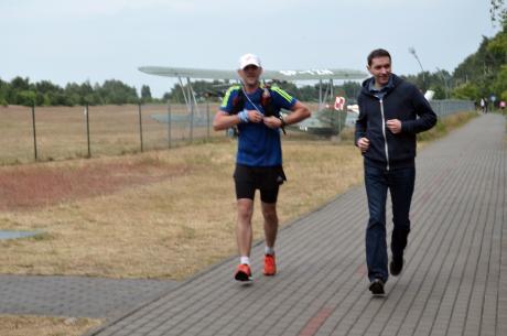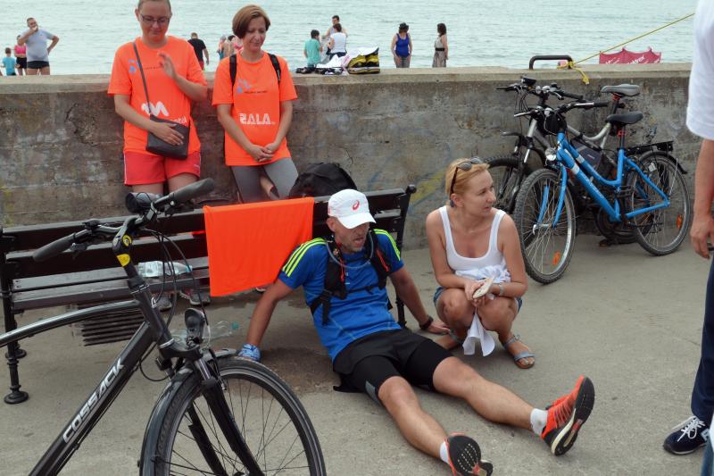 Połowa dystansu (40 km) był we Władysławie. Mały kryzys, ale zwalczyłem go bułką z szynką i serem, snikersem , żelem energetycznym i oczywiście colą. Biegnę dalej i jak się okazało szybciej niż wcześniej. Od 50 km zaczyna padać deszcz, ludzie uciekają z plaży, a dla nas to zbawienie, trochę ochłody. Po godzinie przestaje padać. I tu niespodzianka wybiegam na wysokości Jastarni na mój wierny fanklub, czyli moja żonę i jej brata z narzeczoną. Stwierdzili, że wyglądam nadzwyczaj dobrze, jak na przebiegnięcie takiego dystansu.