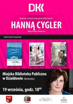 Miejska Biblioteka Publiczna w Działdowie zaprasza na spotkanie autorskie z Hanną Cygler, polską pisarką i tłumaczką. Autorką książek:"Tryb warunkowy", "Grecka mozaika", "Za cudze grzechy" itp. Spotkanie odbędzie się 19 września (wtorek) o godzinie 18.00 w Mediatece. Zapraszamy serdecznie! Informacja: Miejska Biblioteka Publiczna