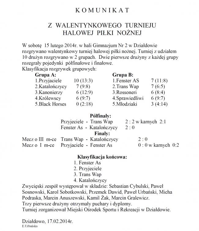 Komunikat z Walentynkowego Turnieju Halowej Piłki Nożnej