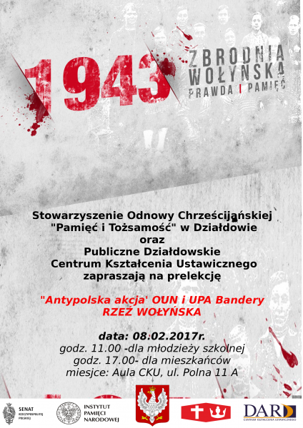 Stowarzyszenie Odnowy Chrześcijańskiej "Pamięć i Tożsamość" w Działdowie oraz Publiczne Działdowskie Centrum Kształcenia Ustawicznego zapraszają na prelekcje pt. "Antypolska akcja OUN i UPA Bandery. Rzeź Wołyńska". Wykład odbędzie się w auli CKU, ul. Polna 11A, 8 lutego 2017 r. (godz. 11.00 - spotkanie dla młodzieży, godz. 17.00 - spotkanie dla mieszkańców). Informacja: Stowarzyszenie Odnowy Chrześcijańskiej "Pamięć i Tożsamość"