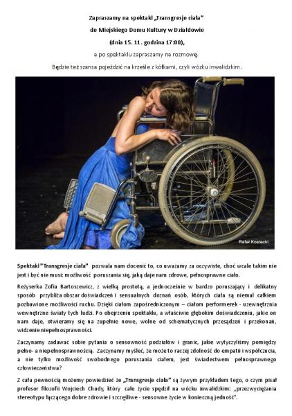 Spektakl "Transgresje ciała" pozwala nam docenić to, co uważamy za oczywiste, choć wcale takim nie jest i być nie musi: możliwość poruszania się, jaką daje nam zdrowe, pełnosprawne ciało.