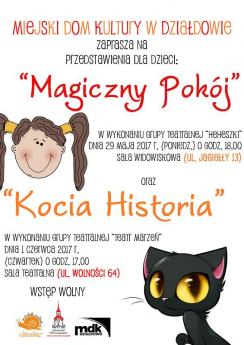 Serdecznie zapraszamy na przedstawienia przygotowane przez dziecięce grupy teatralne działające w Miejskim Domu Kultury w Działdowie. Dnia 29 maja (w poniedziałek) o godz. 18.00 grupa HEHESZKI (z klas IV-VI SP) zaprezentuje przedstawienie pt. "Magiczny pokój". Jest to opowieść o dziewczynce, której pomagają postacie z baśni Andersena. W jej pokoju zaczynają działać moce magiczne, za pomocą których Karolina rozprawia się ze złośliwym bratem i niemiłymi koleżankami. Na spektakl zapraszamy do sali widowiskowej na ul. Jagiełły 13. Wstęp bezpłatny. Natomiast dnia 1 czerwca o godz. 17.00 najmłodsza grupa teatralna MDK - "Teatr Marzeń" (z klas I - III SP) pokaże przedstawienie pt "Kocia historia". Jest to opowieść o kotku, który wyszedł z domu i zabłądził... Na to przedstawienie zapraszamy do małej sali teatralnej na ul. Wolności 64. Wstęp bezpłatny. Informacja: Miejski Dom Kultury