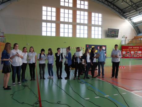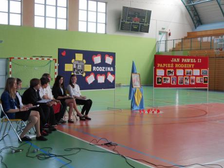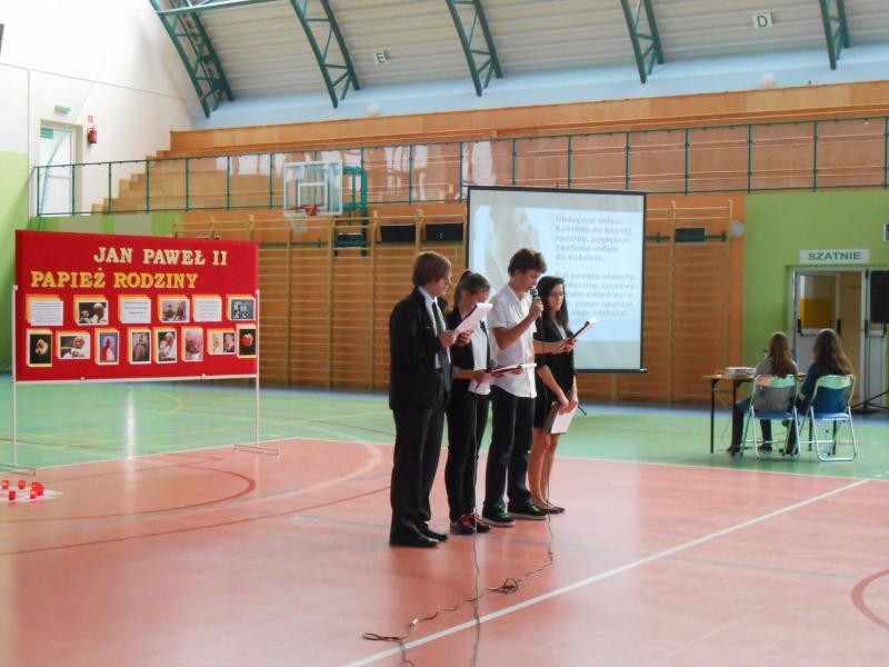 Grupa uczniów pod kierunkiem p. Beaty Karczewskiej przygotowała scenariusz poświęcony Janowi Pawłowi II, dla którego małżeństwo i rodzina zajmowały zawsze szczególne miejsce w nauczaniu. Prowadzący apel uczniowie podkreślali, że temat rodziny zawsze był dla Jana Pawła II bardzo ważny. Rodzina dla Niego to miejsce, w którym w cudowny sposób rodzi się życie. On sam Matkę stracił, gdy był dzieckiem. Ojca - gdy wkraczał w dorosłe życie. Sam stał się największym opiekunem i obrońcą rodziny w dziejach Kościoła. Uczniowie przypomnieli słowa Ojca Świętego, który często mówił: "Trzeba korzystać z doświadczeń życiowych naszych rodziców i dziadków, mieć szacunek dla najstarszych członków naszych rodzin. Ludzie starsi - wołał Papież, dzięki swej dojrzałości i doświadczeniu mogą udzielać młodym rad i cennych pouczeń". Apel uświetniły recytacje wierszy Jana Pawła II oraz występ zespołu wokalnego pod kierunkiem p. Danuty Czeczot. Przygotowano również dekoracje w postaci tablic upamiętniających życie rodzinne Jana Pawła II oraz prezentację multimedialną zawierającą Jego myśli i fotografie.