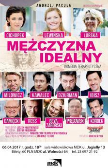6 kwietnia br. w sali widowiskowej Miejskiego Domu Kultury w Działdowie przy ul. Jagiełły 13, o godz.18.00, wystawiona zostanie znakomita komedia terapeutyczna "Mężczyzna Idealny". W spektaklu wystąpią znani aktorzy: Małgorzata Lewińska, Jacek Kawalec, Piotr Pręgowski, Maciej Damięcki.