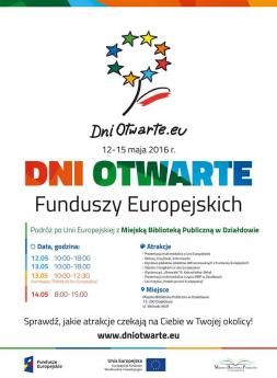 Miejska Biblioteka Publiczna w Działdowie zaprasza do wzięcia udziału w obchodach Dni Otwartych Funduszy Europejskich w dniach 12-14 maja.