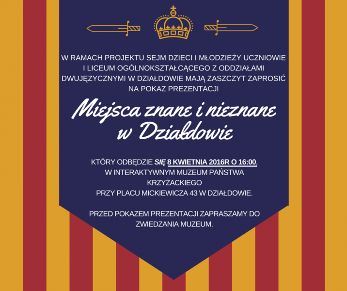 W ramach starań o fotele poselskie podczas XXII sesji Sejmu Dzieci i Młodzieży dwoje uczniów Liceum Ogólnokształcącego im. Stefana Żeromskiego w Działdowie realizuje projekt pt. "Miejsca znane i nieznane w Działdowie". W ramach projektu, 8 kwietnia w Interaktywnym Muzeum Państwa Krzyżackiego odbędzie się pokaz prezentacji.