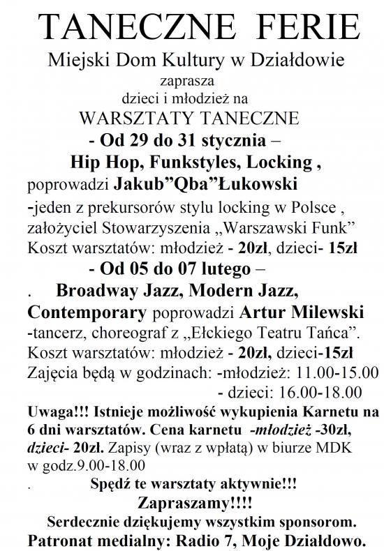 Miejski Dom Kultury w Działdowie zaprasza dzieci i młodzież na warsztaty taneczne, które odbywać się będą od 29 stycznia do 7 lutego