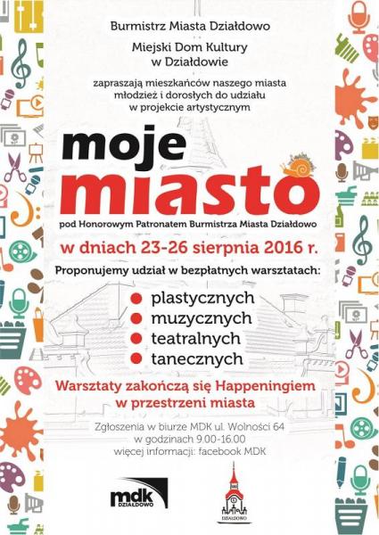 Zapraszamy wszystkich odważnych, aktywnych i kreatywnych mieszkańców naszego miasta (młodzież i dorosłych jak również członków stowarzyszeń i grup działających na terenie Działdowa) do udziału w 4-dniowym projekcie artystycznym pod hasłem "Moje Miasto".