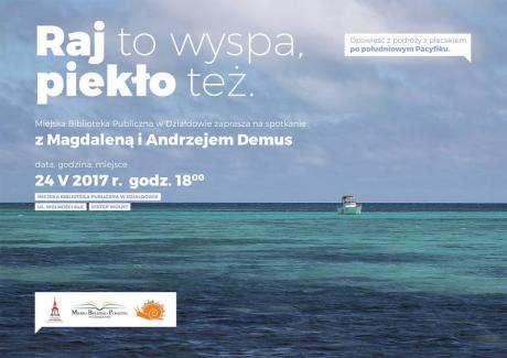 Miejska Biblioteka Publiczna w Działdowie zaprasza wszystkich pasjonatów podróżowania i nie tylko na spotkanie Magdaleną i Andrzejem Demus pt. "Wyspa to raj, piekło też" - opowieść z podróży z plecakiem po południowym Pacyfiku. Spotkanie odbędzie się 24 maja o godz. 18.00 w dziale Mediateka Miejskiej Biblioteki Publicznej w Działdowie. Informacja: Miejska Biblioteka Publiczna