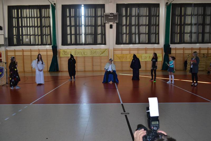 Uczniowie starszych klas przygotowali krótkie przedstawienie pt. "Duchy szkoły". Wcielili się w role Opiekuńczych Zjaw, w których mogli się odnaleźć obecni nauczyciele oraz ci, którzy tworzyli historię tej szkoły. Przewodniczył im Król Szkoły, którego zagrał Jędrzej Piórek. Pozostali aktorzy to: