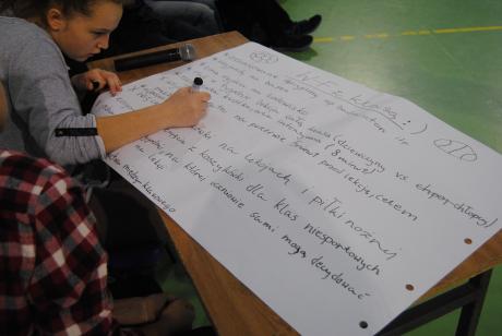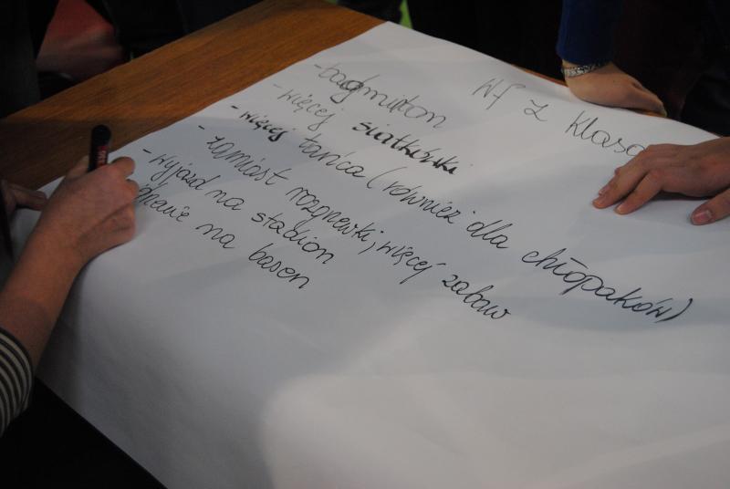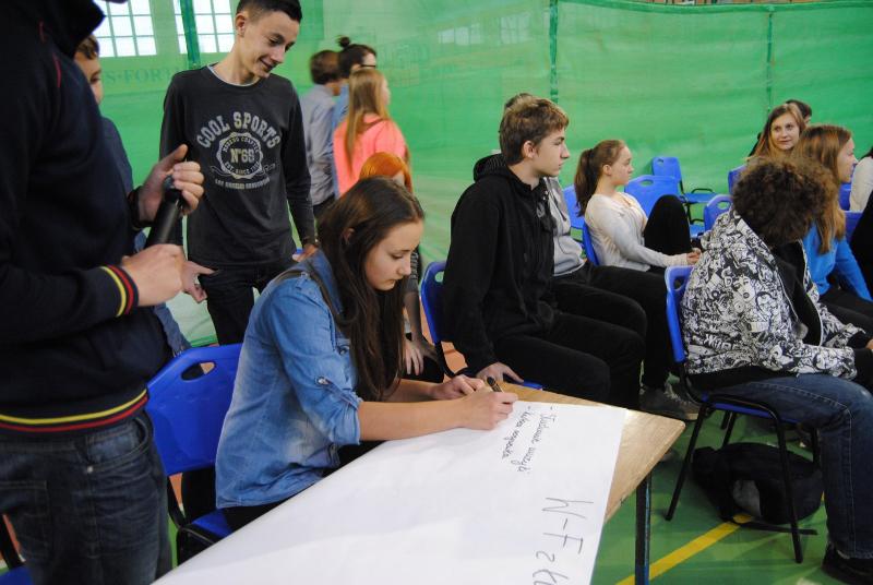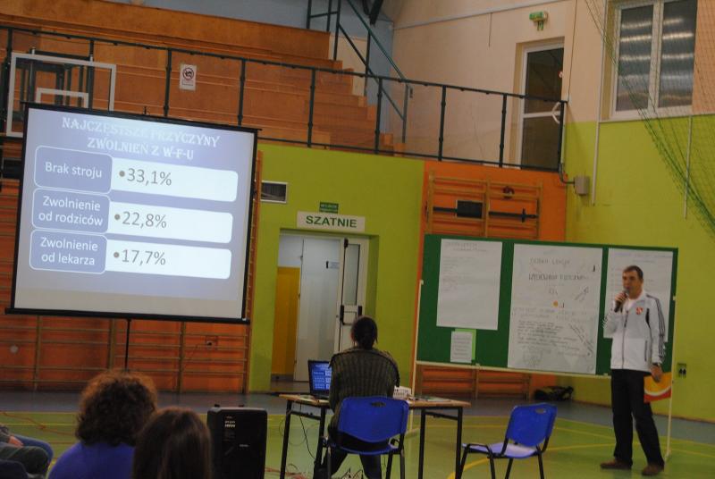 Kolejnym etapem były wynik ankiety uczniów gimnazjum o wychowaniu fizycznym w której uczestniczyło 290 uczniów (78%). W naszej szkole wychowanie fizyczne przez uczniów jest postrzegane jako jedna z najlepszych lekcji. Blisko 90% uczniów lubi w-f a 92% uznało lekcje za atrakcyjne, urozmaicone, ciekawe, intensywne. W debacie delegaci wypracowali kilka postulatów dzięki którym możemy jeszcze uatrakcyjnić zajęcia z wychowania fizycznego.