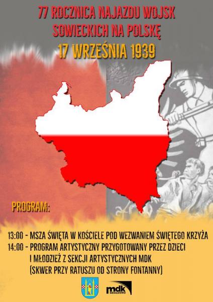 Burmistrz Miasta Działdowo oraz Miejski Dom Kultury w Działdowie zapraszają mieszkańców naszego miasta na uroczystość upamiętniającą najazd wojsk sowieckich na Polskę - 17 września 1939 r.