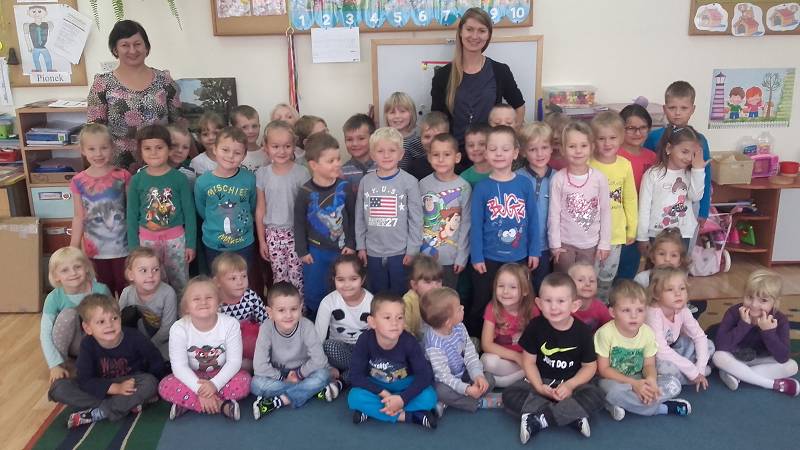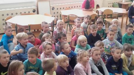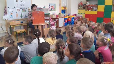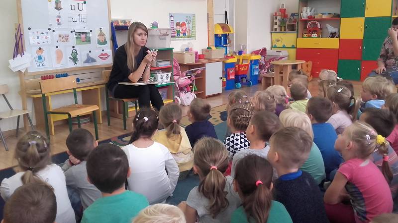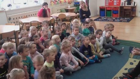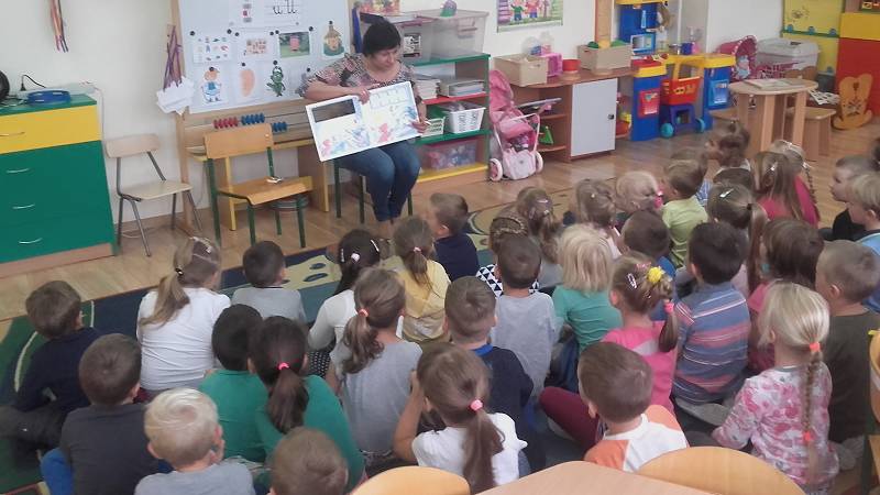 Dzieci wysłuchały bajek "Czerwony Kapturek" oraz "Trzy świnki". Przedszkolaki z wielkim zainteresowaniem obejrzały również teatrzyk Kamishibai pt. "Brzydkie kaczątko". Dzieci uczestniczyły w rozmowie na temat tolerancji wobec kolegów i koleżanek oraz zasad ograniczonego zaufania wobec nieznajomych. Na zakończenie zostało zrobione pamiątkowe zdjęcie.