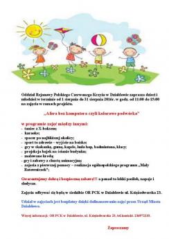 Zaplanowaliśmy ciekawe zajęcia, które będą się odbywać przy siedzibie PCK, ul. Księżodworska 23, od poniedziałku do piątku w godz. 11:00-15:00 od 1 sierpnia do 31 sierpnia 2016 r.