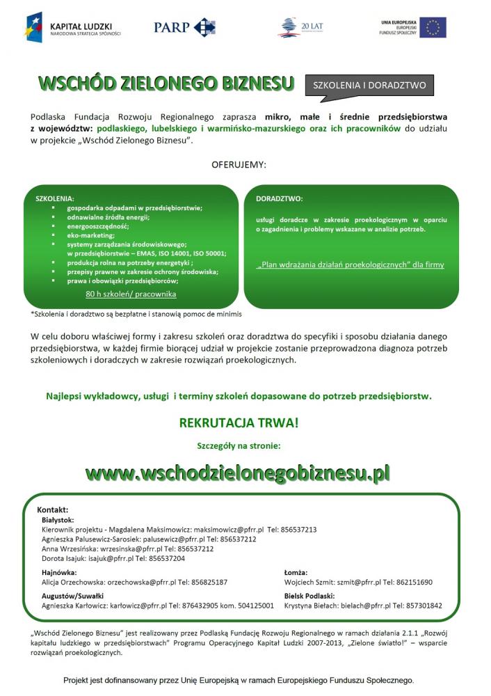 Podlaska Fundacja Rozwoju Regionalnego zaprasza mikro, małe i średnie przedsiębiorstwa oraz ich pracowników do udziału w projekcie "Wschód Zielonego Biznesu"