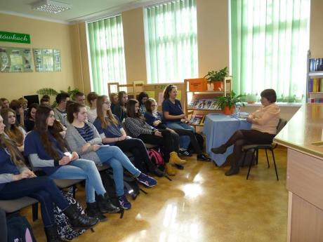 W dniu 23 lutego 2016 r. w bibliotece Gimnazjum nr 1 im. Króla Władysława Jagiełły odbyło się spotkanie uczniów naszej szkoły oraz członków Dyskusyjnego Klubu Książki z panią Elżbietą Zakrzewską, autorką książki "Moja Młyńska".