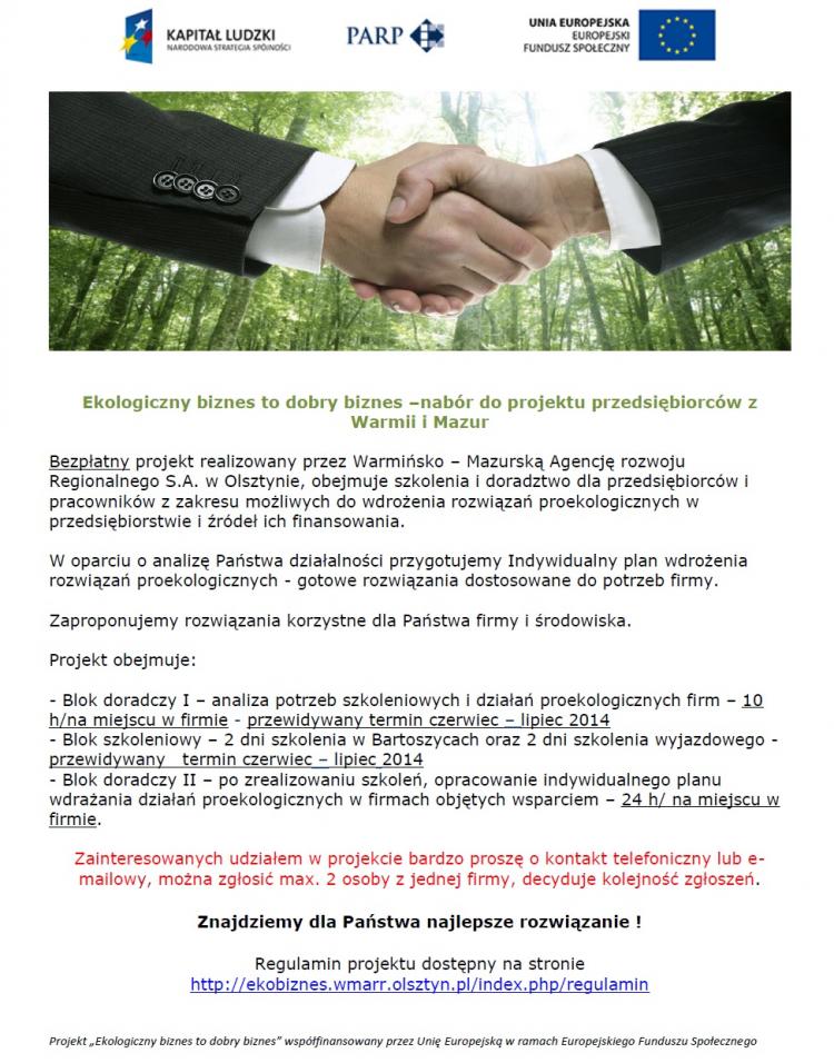 Bezpłatny projekt realizowany przez Warmińsko - Mazurską Agencję rozwoju Regionalnego S.A. w Olsztynie, obejmuje szkolenia i doradztwo dla przedsiębiorców i pracowników z zakresu możliwych do wdrożenia rozwiązań proekologicznych w przedsiębiorstwie i źródeł ich finansowania