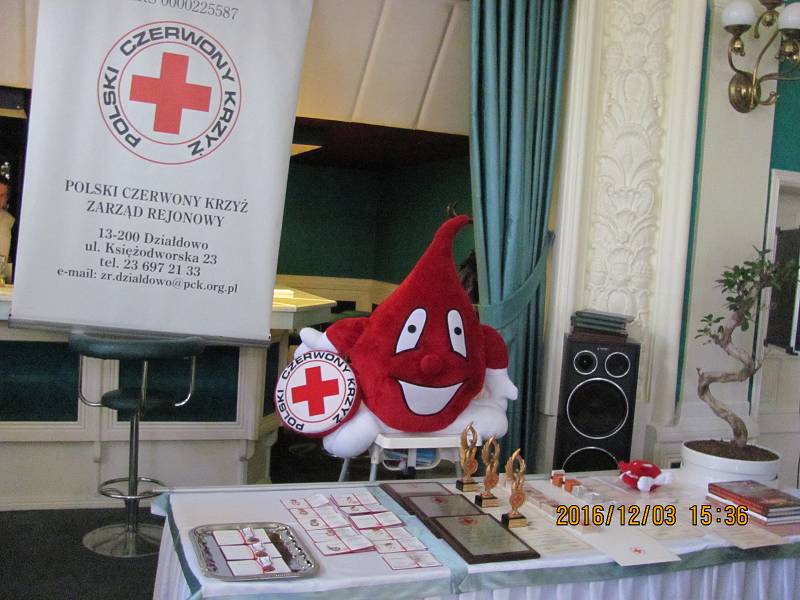 Już tradycyjnie w dniach 22 - 26 listopada każdego roku obchodzimy Dni Honorowych Dawców Krwi. 03 grudnia 2016 roku Zarząd Rejonowy Polskiego Czerwonego Krzyża w Działdowie zorganizował w restauracji "Wkra" uroczystą Galę, na której wręczano odznaczenia, odznaki, statuetki, wyróżnienia i podziękowania. Uroczystość swoją obecnością zaszczycili: Radna Sejmiku Warmińsko - Mazurskiego - Teresa Nowakowska, Wicestarosta Działdowski - Marian Brandt, Burmistrz Miasta Działdowo - Grzegorz Mrowiński, Dyrektor Warmińsko - Mazurskiego Oddziału Okręgowego PCK w Olsztynie - Andrzej Karski, przedstawiciele Klubów Honorowych Dawców Krwi z Lidzbarka, Gródek, Rybna, Działdowa i Służb Mundurowych oraz opiekunowie i uczniowie szkół ponadgimnazjalnych. Z uwagi, iż w dniu 05 grudnia przypada Międzynarodowy Dzień Wolontariusza w uroczystości udział wzięła opiekunka Szkolnego Koła PCK przy Gimnazjum nr 2 w Działdowie - Małgorzata Piotrowicz wraz z wolontariuszami i opiekun klubu integracyjnego dla dzieci i młodzieży "Uśmiechnięta przystań w PCK". Uroczystości uświetniły występami dzieci z Niepublicznej Szkoły Podstawowej w Słupie a jeszcze bardziej uroczystego charakteru nadały mu posiadane przez oddział sztandary klubów HDK w Działdowie i Lidzbarku.