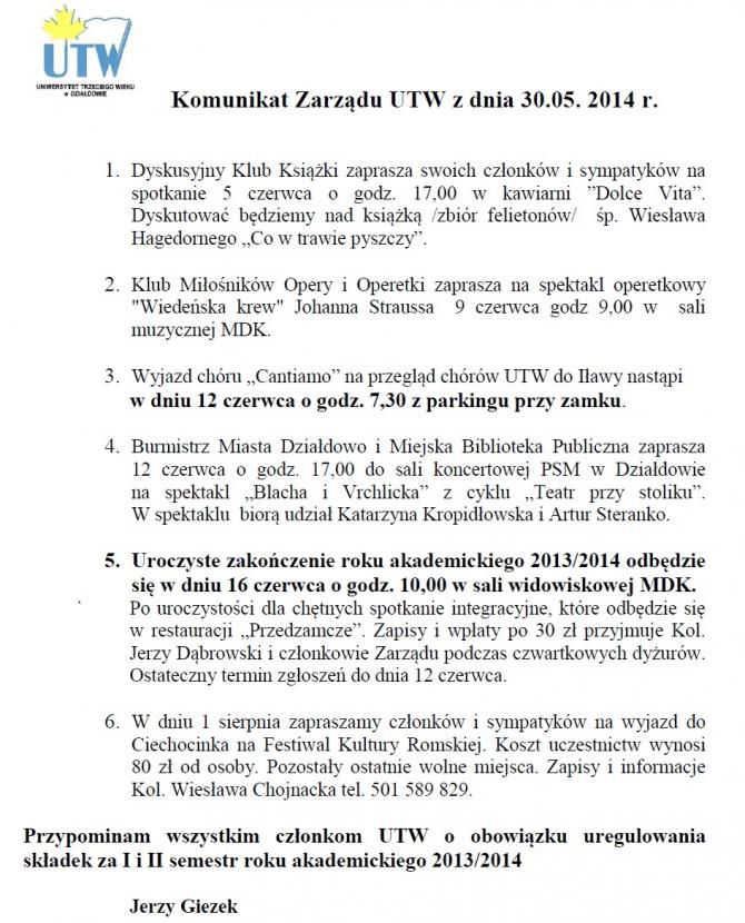 Komunikat Zarządu UTW z dnia 30.05.2014 r.