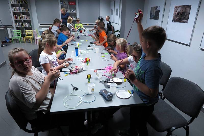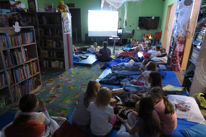 Wieczór rozpoczęliśmy integracyjnym ogniskiem z pieczeniem kiełbasek. Nie zabrakło lubianych przez dzieci zajęć plastycznych. Wszyscy w skupieniu pracowali nad oryginalnymi łapaczami snów i pamiątkowymi torbami, które własnoręcznie ozdabiali. Później nadeszła kolej na piżama party i wyciszenie podczas czytania książki pt. "Tajemnica biblioteki" przy świetle latarek. Nawiązując do tegorocznego hasła Nocy Bibliotek "Czytanie porusza" oglądaliśmy "poruszający" film o przyjaźni człowieka z psem, podczas którego nie mogło zabraknąć popcornu i chipsów :) (informacja dla wtajemniczonych - w bibliotece można znaleźć książkę, na podstawie której nakręcony był ten film). Wszystkich szczegółów nie zdradzamy zgodnie z przyrzeczeniem, że "wszystko, co zdarzy się w tych murach musi zostać w nich na zawsze".
