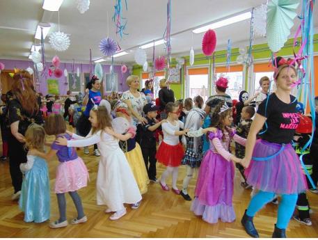 Dzieci świetnie się bawiły uczestnicząc wspólnie ze swoimi paniami w zabawach prowadzonych przez prowadzących imprezę "IMPREZA JAK MARZENIE". Podczas trwania balu odbyły się różne zabawy i konkursy, oraz inne atrakcje tj. zjeżdżanie z dmuchanej zjeżdżalni, malowanie twarzy, wata cukrowa. Skoczna i rytmiczna muzyka zachęcała do tańca. Wspólna zabawa przysporzyła wiele radości naszym pociechom, a to było głównym celem naszego balu. Było bardzo radośnie, kolorowo i zabawnie.