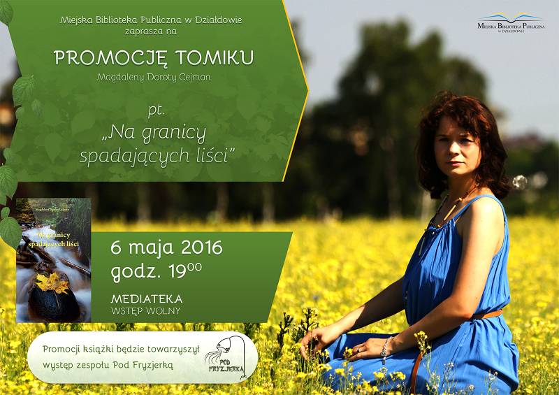 Miejska Biblioteka Publiczna w Działdowie zaprasza na promocję nowego tomiku poezji Magdaleny Cejman pt. "Na granicy spadających liści". Promocja odbędzie się w piątek 6 maja 2016 r. w Mediatece o godzinie 19.00. Podczas spotkania atmosferę będzie umilał zespół "Pod Fryzjerką". Zapraszamy wszystkich serdecznie. Wstęp wolny. Materiały: MBP w Działdowie