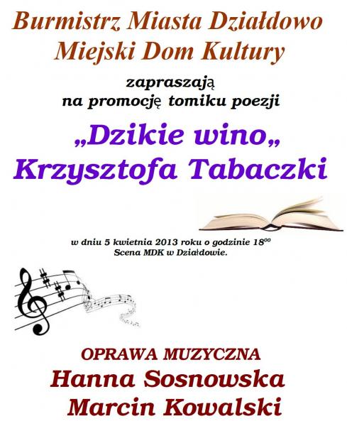 Burmistrz Miasta Działdowo, Miejski Dom Kultury zapraszają na promocję tomiku poezji "Dzikie wino" Krzysztofa Tabaczki
