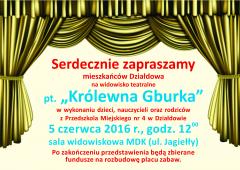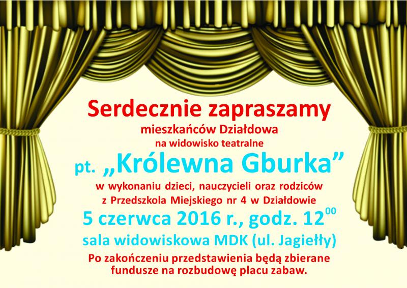 Przedszkolaki, nauczycielki i rodzice serdecznie zapraszają na spektakl pt. "Królewna Gburka", który zostanie wystawiony 4 czerwca (godz. 10.00) i 5 czerwca (godz. 12.00) na deskach działdowskiego domu kultury (przy ul. Jagiełły).