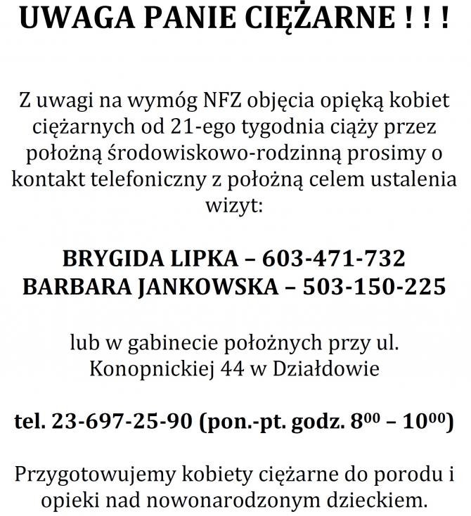 Z uwagi na wymóg NFZ objęcia opieką kobiet ciężarnych od 21-ego tygodnia ciąży przez położną środowiskowo-rodzinną prosimy o kontakt telefoniczny