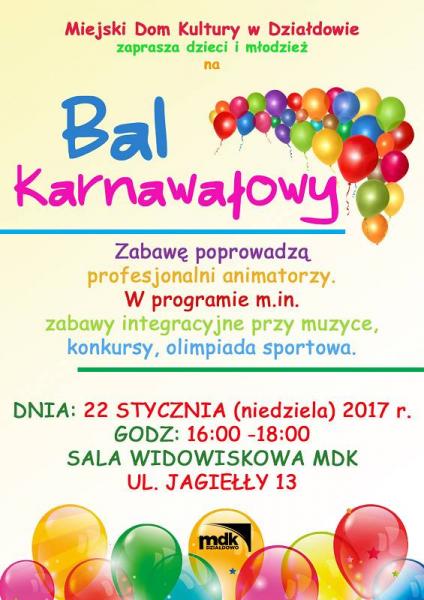 Zabawy i konkursy, tańce i pląsy poprowadzą profesjonalni animatorzy z Olsztyna. Karnawałowy bal zobowiązuje, toteż zakładamy kolorowe, różnorodne kostiumy i w dobrych humorach stawiamy się o godz. 16.00 w Miejskim Domu Kultury w Działdowie (ul. Jagiełły 13). Będziemy wybierali Króla i Królową Balu, odbędzie się prezentacja mody karnawałowej oraz spartakiada sportowa.