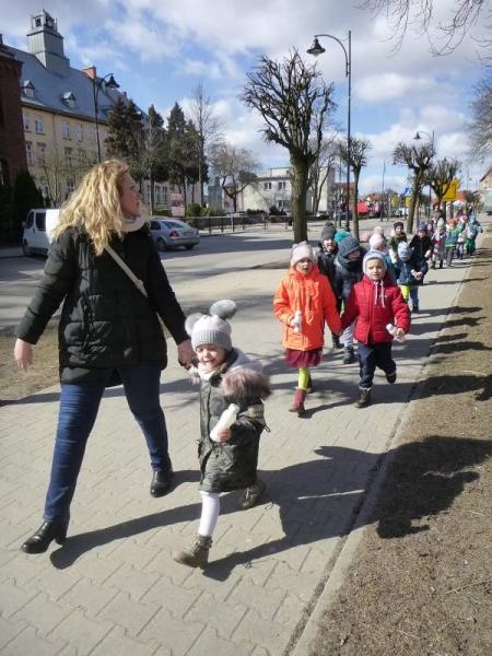 Podczas zabaw tanecznych, pląsy i śpiewy wypełniały całe przedszkole. Radosny, wiosenny nastrój udzielił się wszystkim. Następnie z Marzanną, grzechotkami i pomponami przemaszerowaliśmy ulicami miasta, aby powitać długo oczekiwaną wiosnę. Mimo mroźnej pogody twarze dzieci były rozjaśnione niczym słońce.