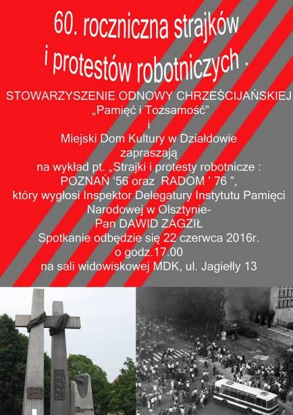 Stowarzyszenie Odnowy Chrześcijańskiej "Pamięć i Tożsamość" i MDK w Działdowie zapraszają na wykład pt. "Strajki i protesty robotnicze POZNAŃ '56 i RADOM '76", który wygłosi Inpsektor IPN Delegatura w Olsztynie - Pan Dawid Zagził. Spotkanie odbędzie się 22 czerwca o godz. 17.00 w sali MDK, ul Jagiełły 13.