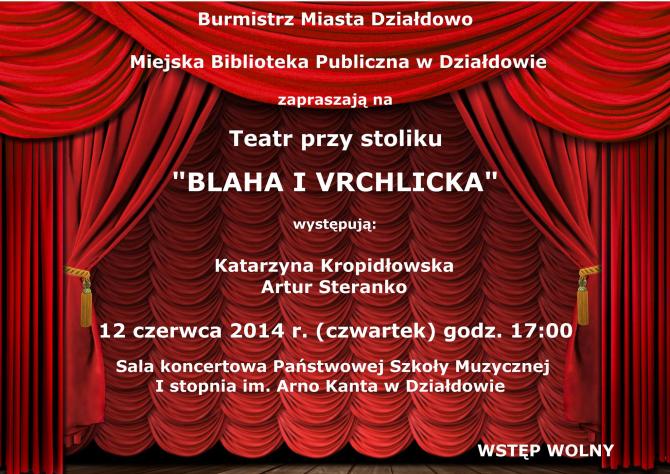 Burmistrz Miasta Działdowo i Miejska Biblioteka Publiczna w Działdowie zapraszają na Teatr przy stoliku "BLAHA i VRCHLICKA"